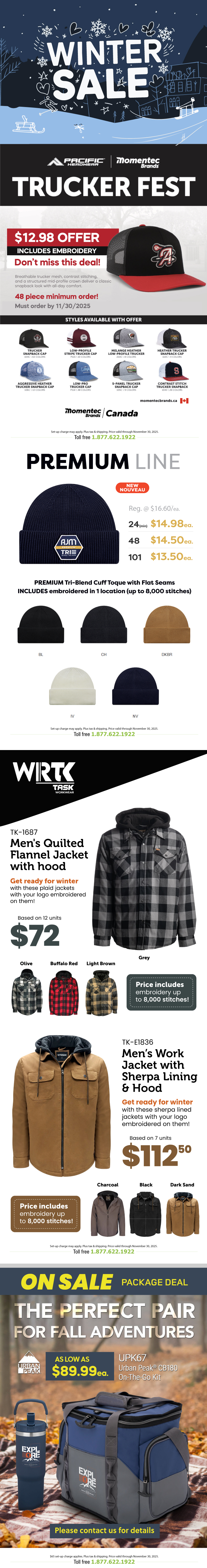 WOW - this year is going by so fast - eh? Here we are in November and the time to order your Christmas/year end items for you, your customers & employees is upon us. Stock is still good for most items. I have some ideas I like to highlight below, but remember that is just a sampling of what's available to you. We have an amazing deal on Pacific Headwear trucker caps. 8 different styles, each coming in a wide range of colours. The price includes standard embroidery in 1 location. We have many styles of toques available to keep your head warm, but if you're looking for one that is a step above the rest, please check out the premium tri-blend below and take advantage of the discounted pricing. We have two items from Task workwear I would like to bring to your attention below. Both items are very nice quality and will keep you warm and stylish when you're working outside. Are you looking for something real special to hand out to your customers or employees, please check out this package deal from Urban Peak with your logo on both items for one price and only one set-up. Do you have another idea? Let me know your thoughts. Jason and I are standing by waiting you hear from you!